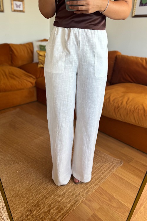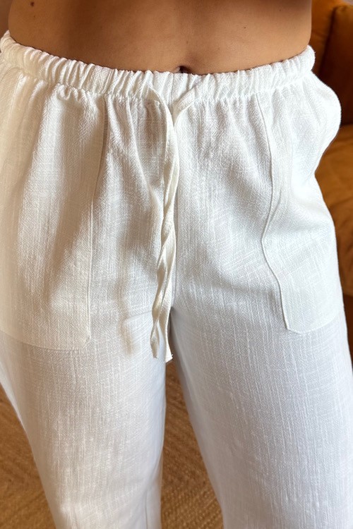 Beyaz cepli bağcıklı kullanışlı keten pantolon.