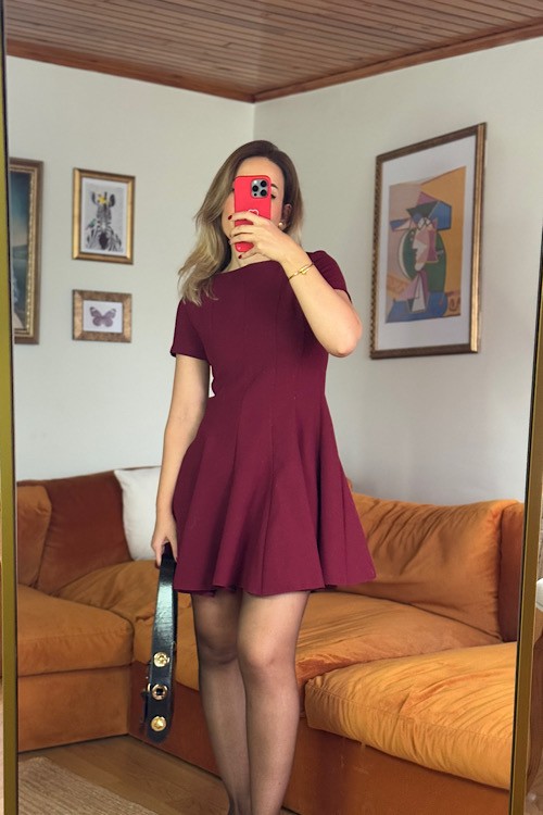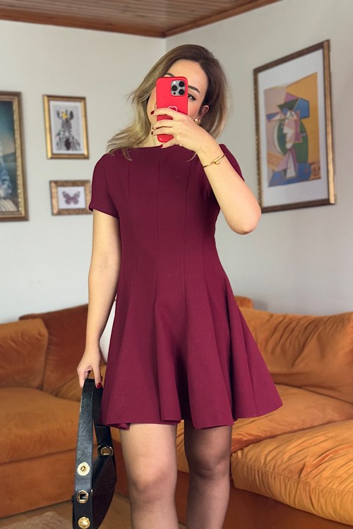 Bordo kalın pileli kısa kollu kiloş elbise.