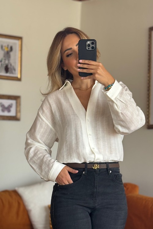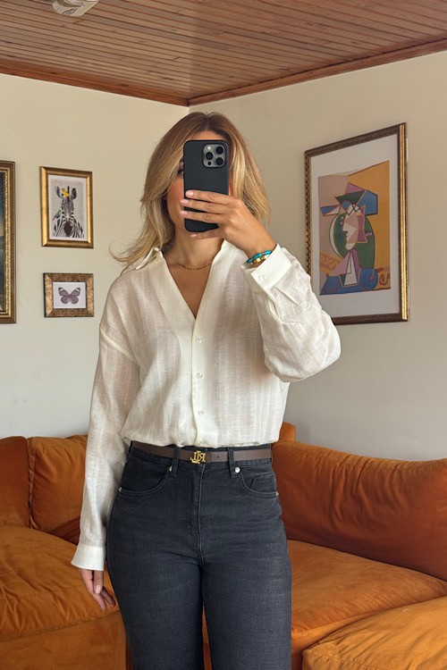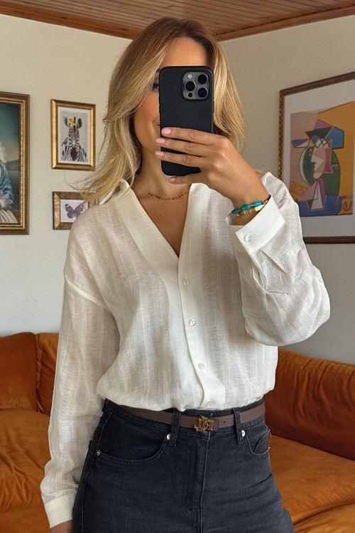 Ekru V yaka pamuklu transparan kullanışlı gömlek.