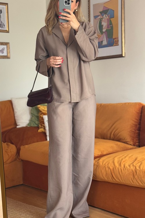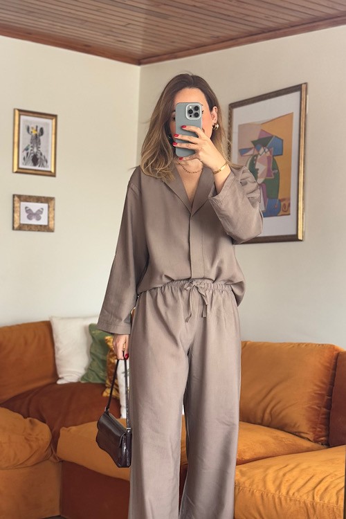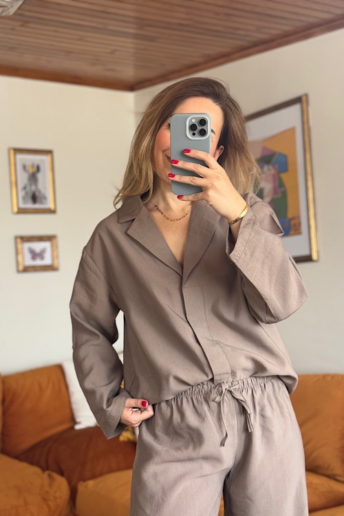 Kahve pamuklu takım tensel kumaşa yakındır.