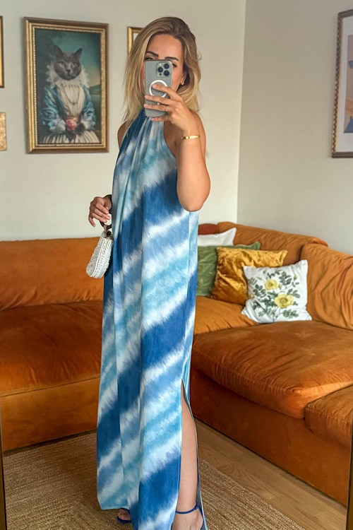 Mavi halter yaka boyundan bağlamalı desenli yırtmaçlı şık elbise.