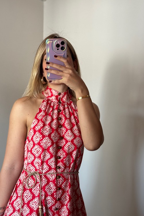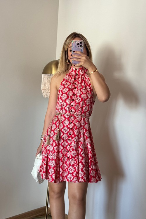 Nar çiçeği halter yaka düğmeli ve bağcıklı kiloş elbise.