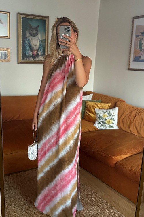 Pembe halter yaka boyundan bağlı yırtmaçlı desenli elbise.