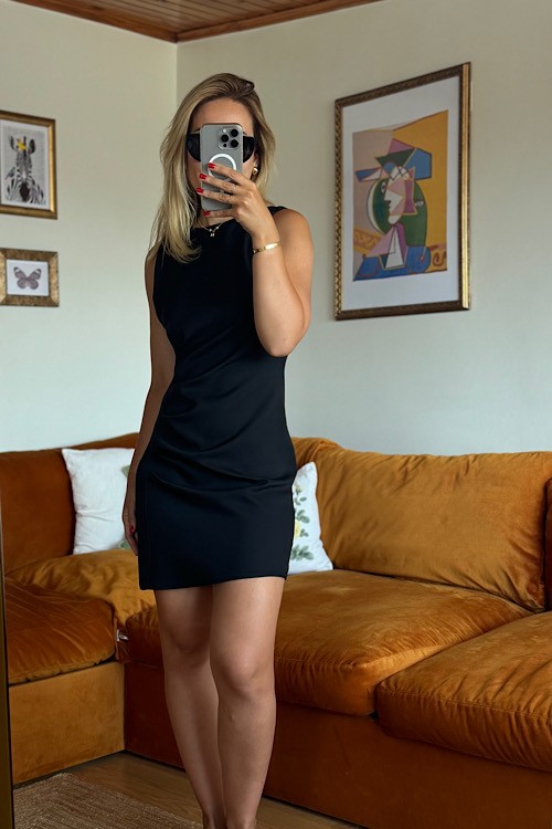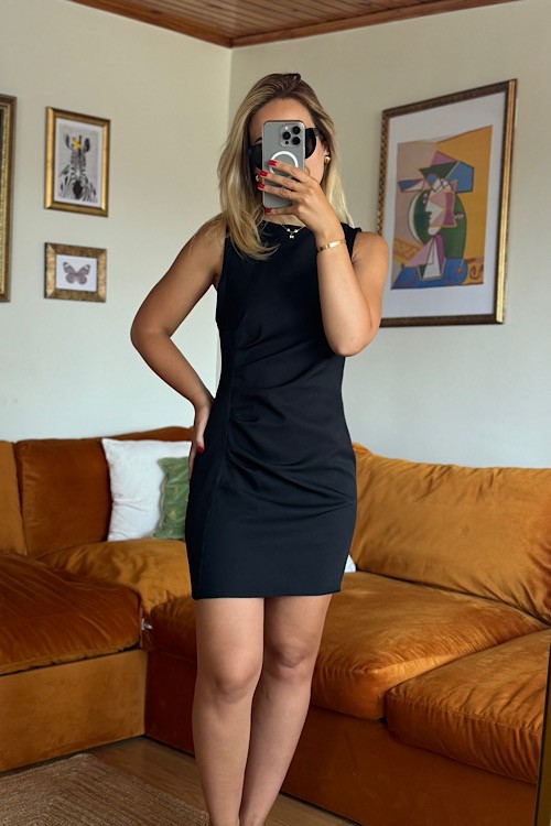 Siyah drape detaylı kolsuz kısa elbise.