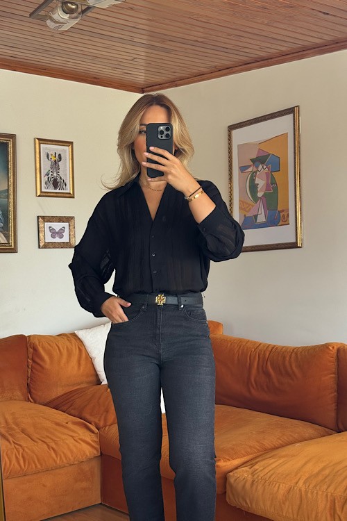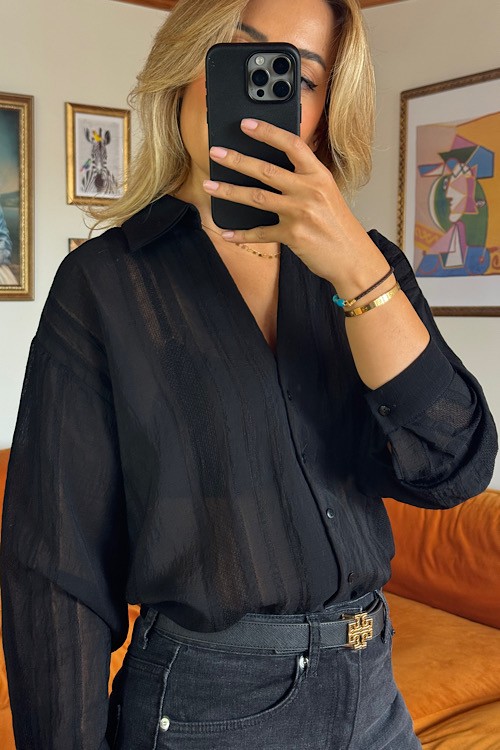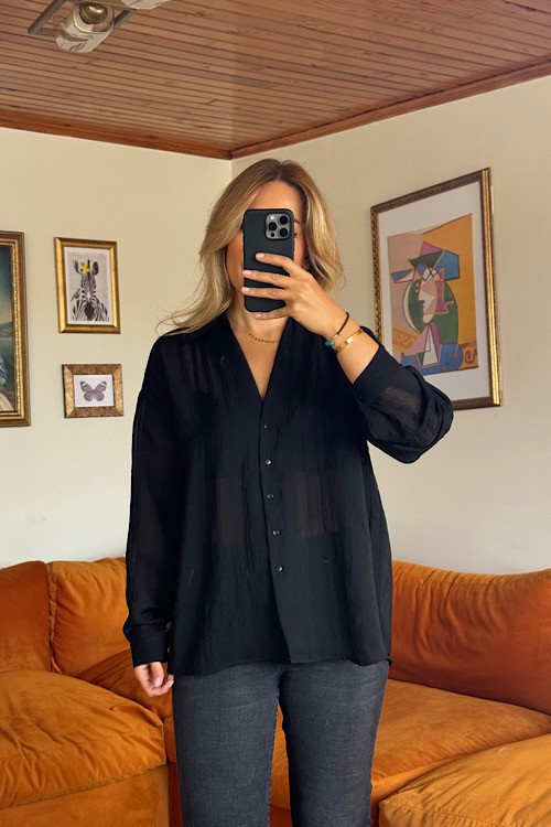 Siyah v yaka çizgi şeklinde transparan kullanışlı gömlek.