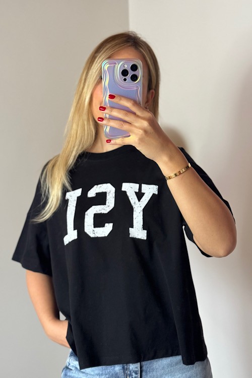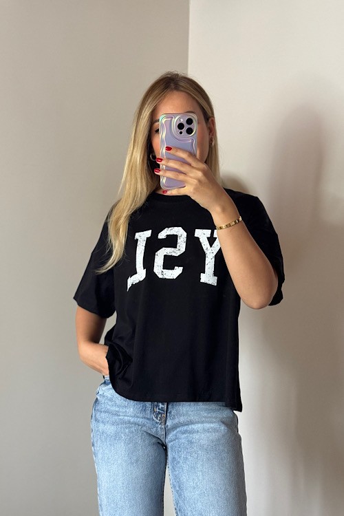 Siyah ön tarafı yazılı bisiklet yaka tişört.
