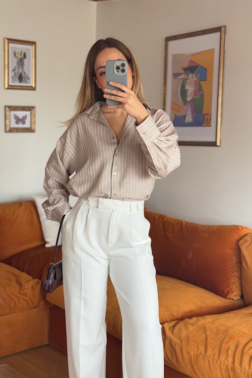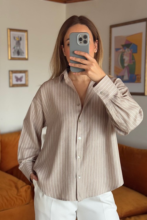 Taş rengi çizgili pamuklu gömlek