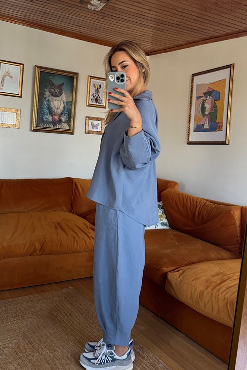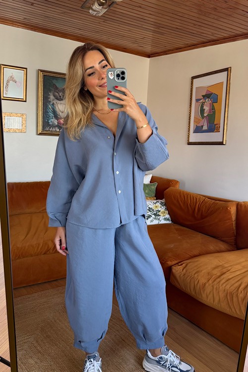 Mavi tensel kumaş aşırı rahat üzerinizde yok gibi hissedeceğiniz bir takım. Gömlek standart beden pantolon ise bedenlidir.
