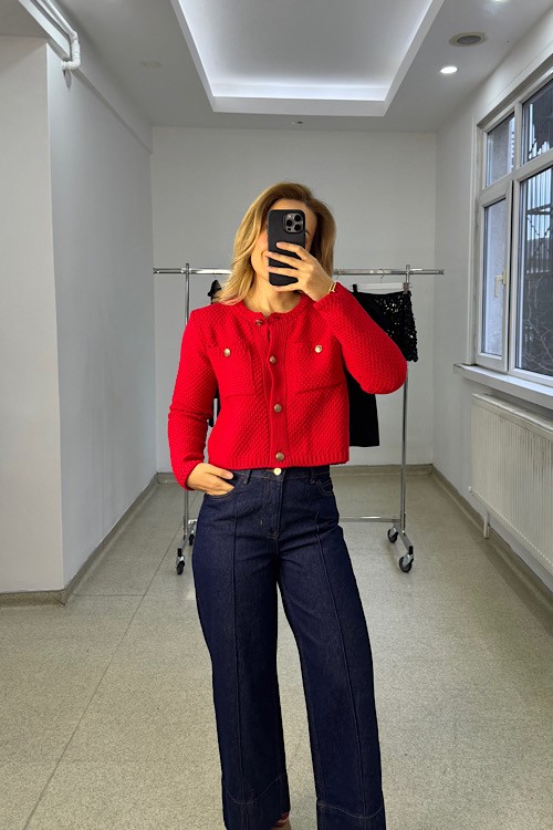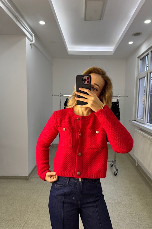 Kırmızı eskitme gold düğmeli tüvit modeli hırka.