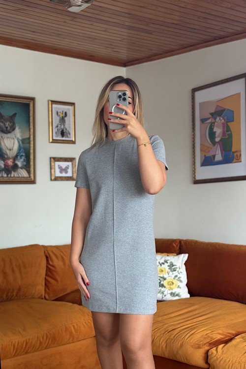 Gri kısa kollu bisiklet yaka likralı kısa elbise.