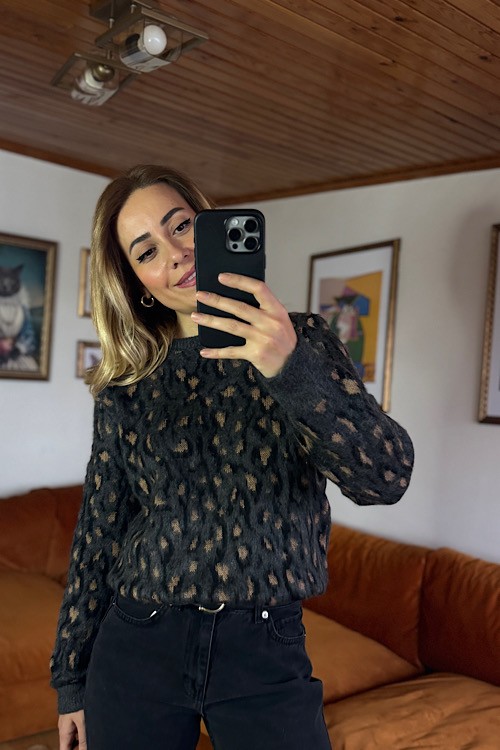 Gri leopar desen görünümlü triko kazak.