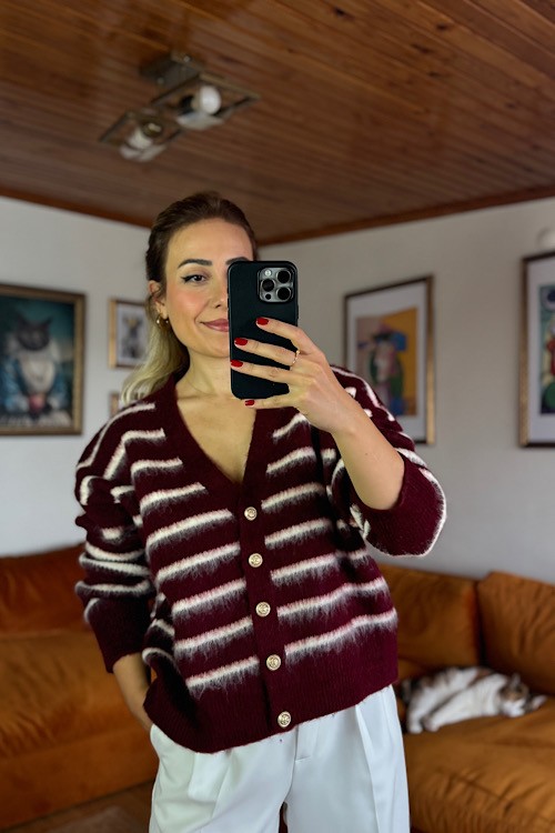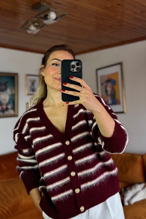 Bordo ekru çizgili gold düğmeli v yaka hırka.