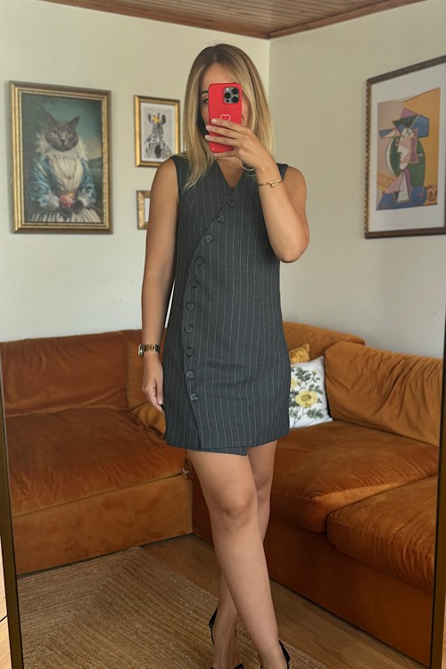 Gri çizgili asimetrik düğmeli elbise.