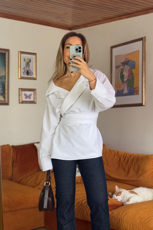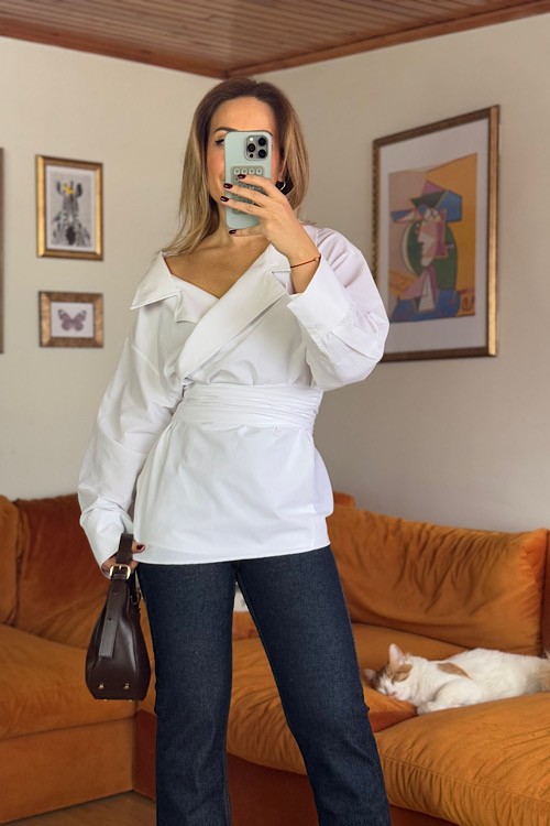 Beyaz v yaka kruvazeli kışaklı gömlek.