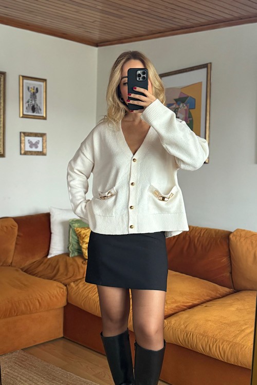 Ekru ceplerinde zincir detayları olan gold düğmeli hırka.