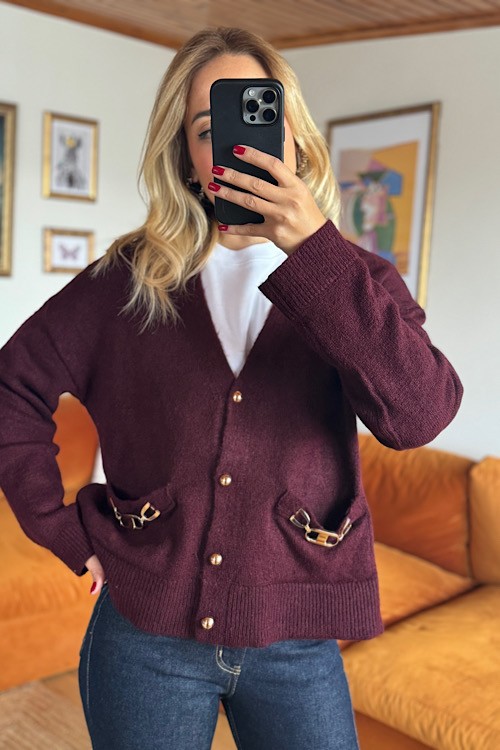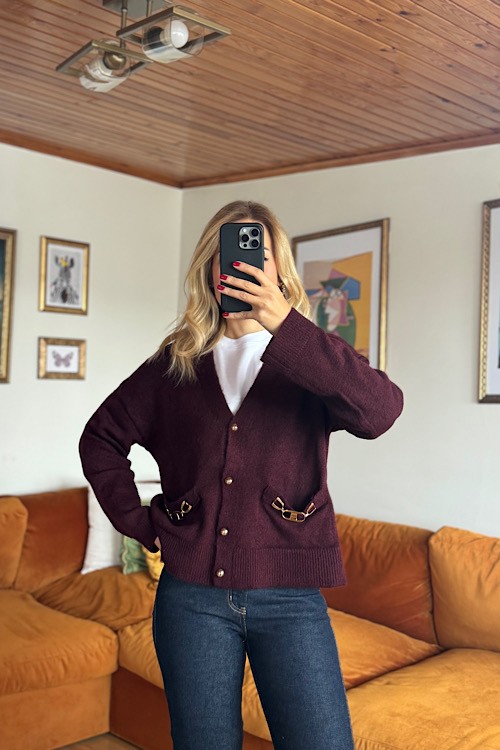 Bordo ceplerinde zincir detayı olan gold düğmeli hırka.