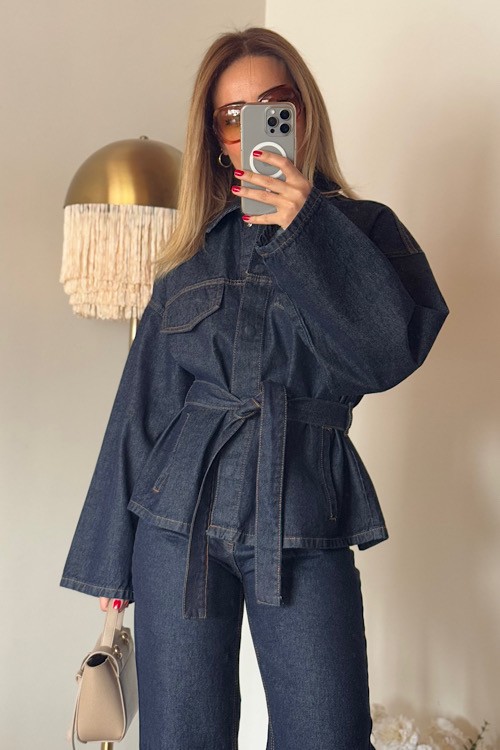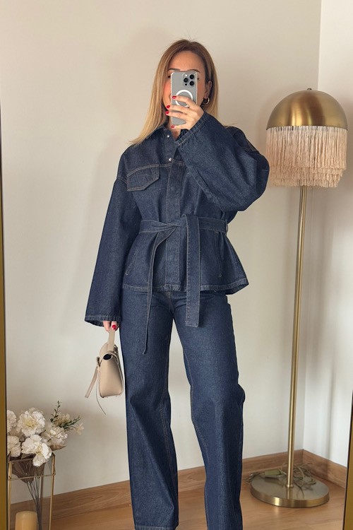 Ceketi kuşaklı jean takım.