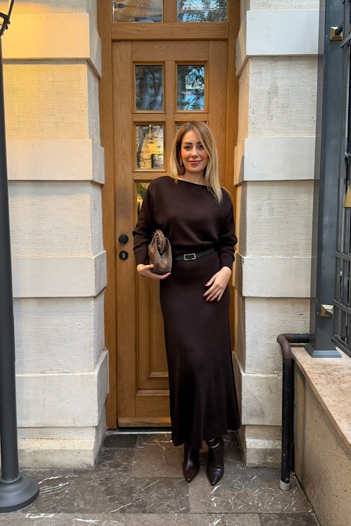 Kahve kayık yaka kendinden kemerli midi boy triko elbise.