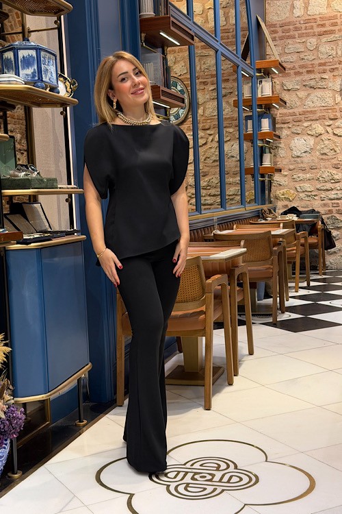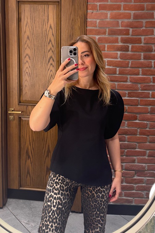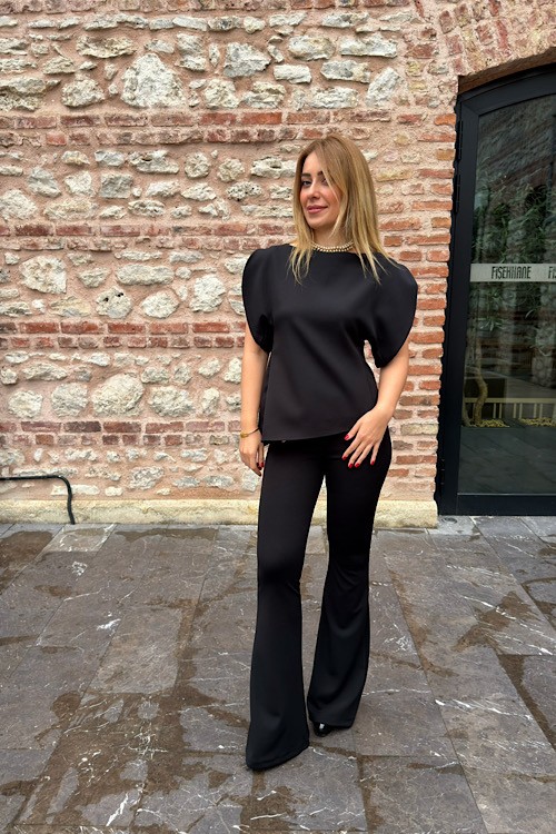 Siyah kolları balon gelen omuzkısımları açık bluz etek ucu asimetrik kesim arkası fermuarlı şık spor bluz.