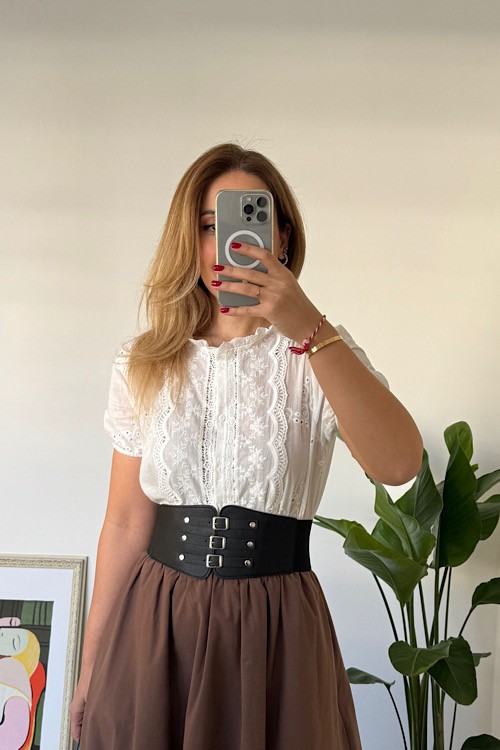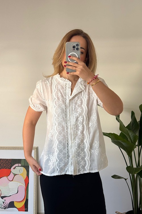 Ekru hakim yaka karpuz kol fistolu işlemeli gönlek.