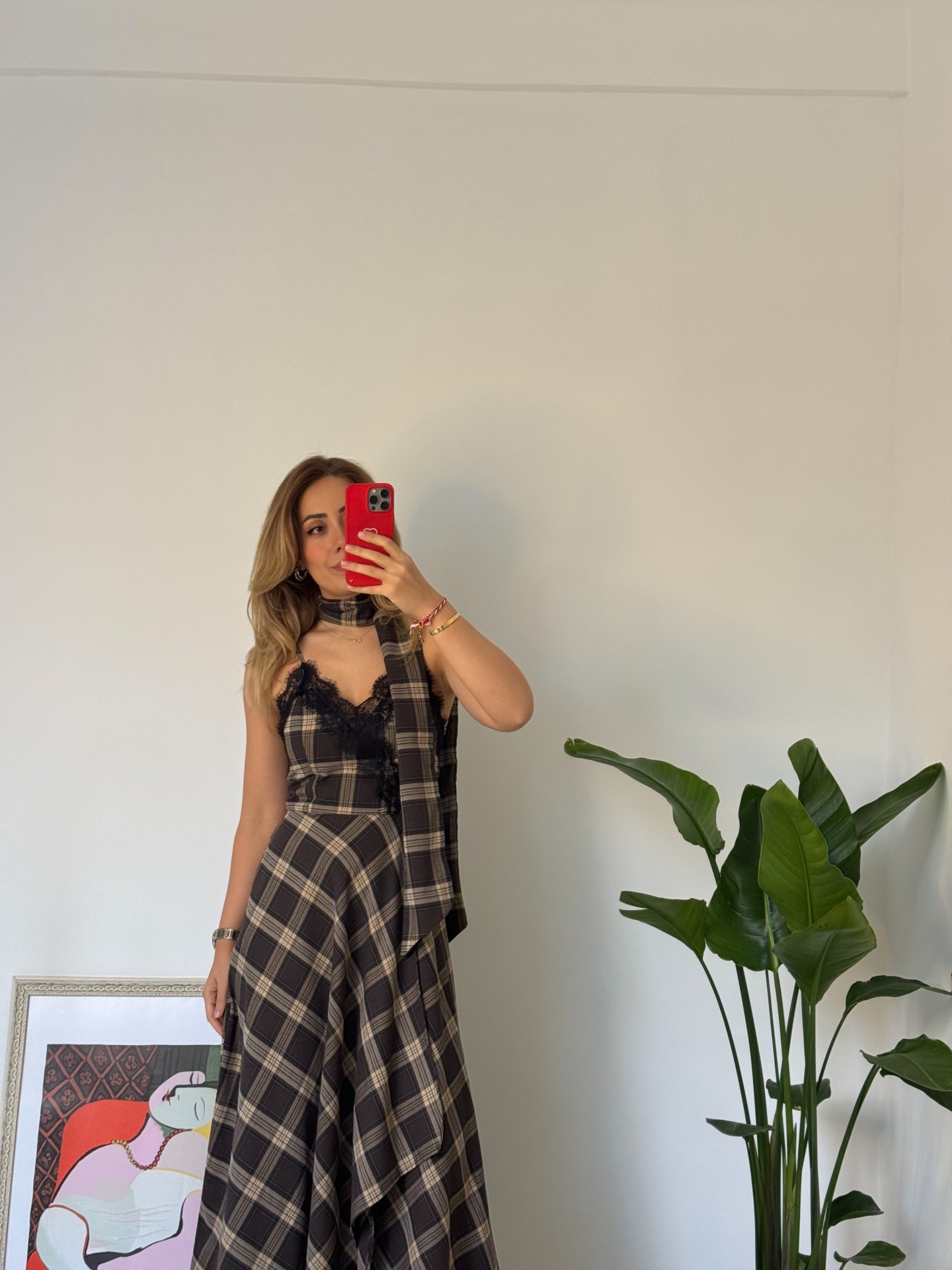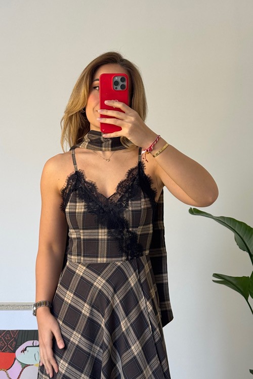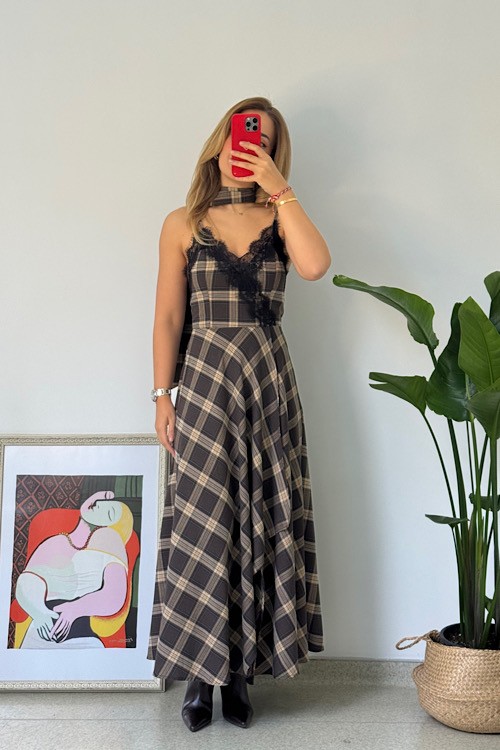 Ekoseli dantel detaylı askılı ve şallı elbise.