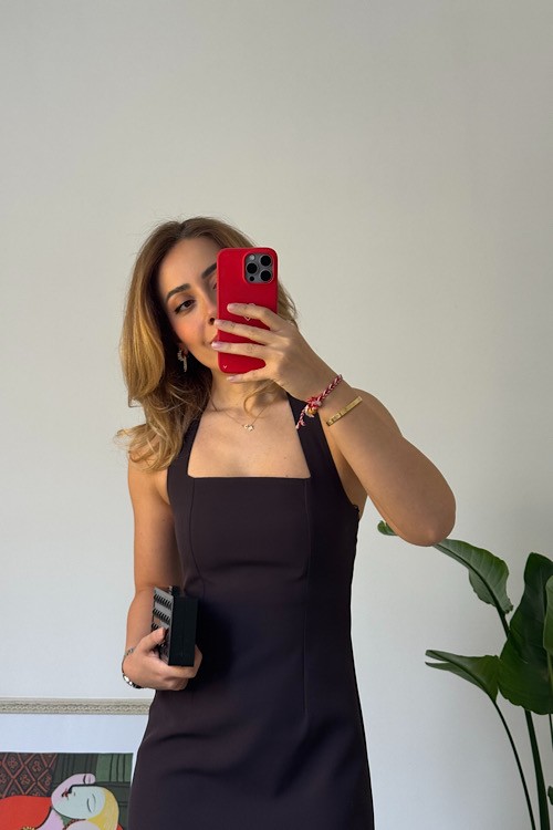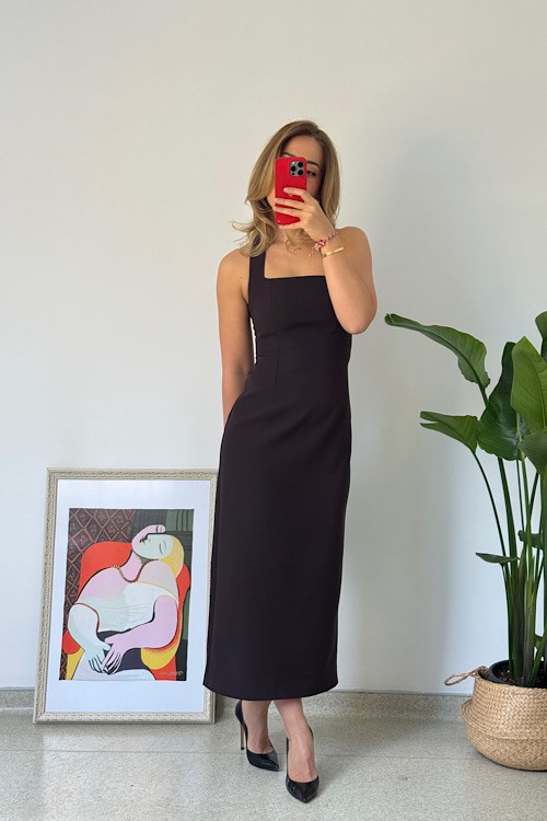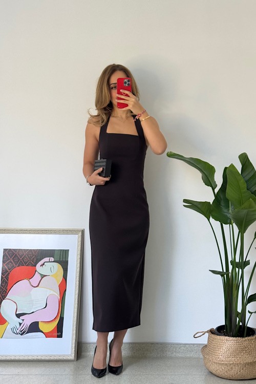 BOYUNDAN ASKILI MİDİ ELBİSE - Kahve