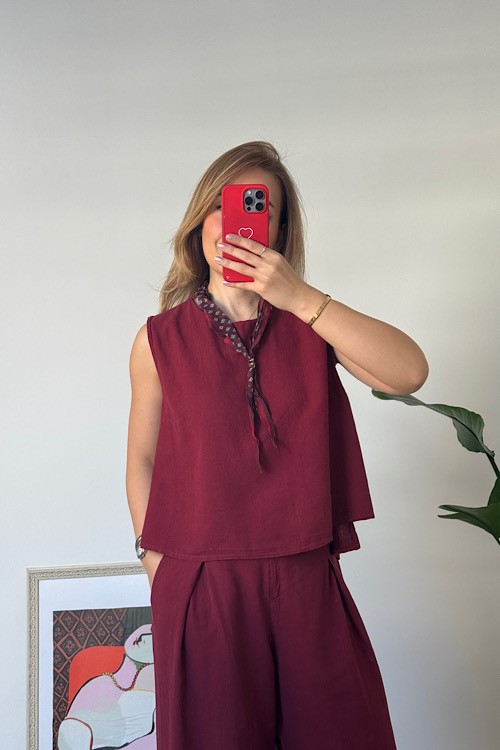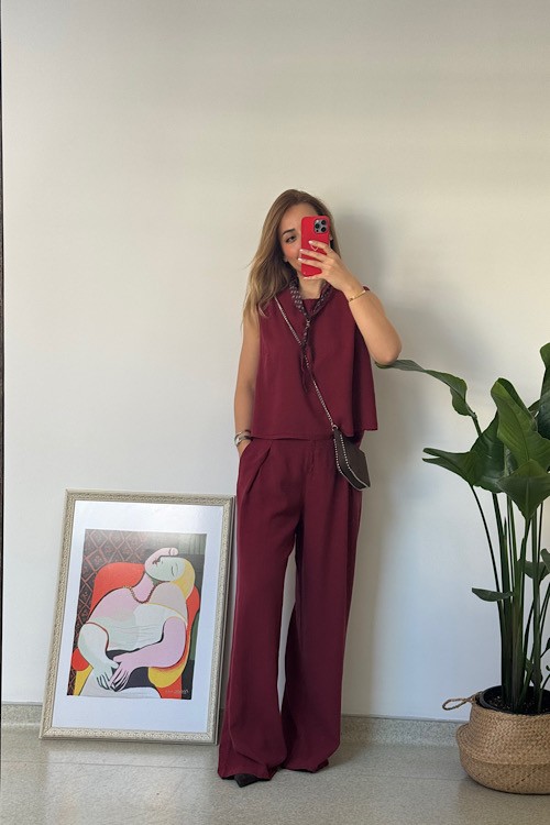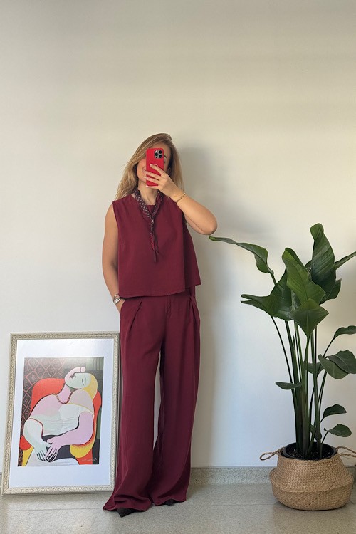 Bordo rengi %100 keten takım alt üst ayrı ayrı da kullanılabilir.