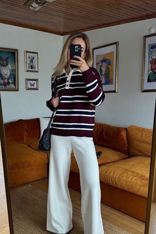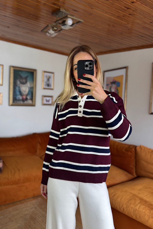 Renkli çizgili çok kullanışlı polo yaka kazak.