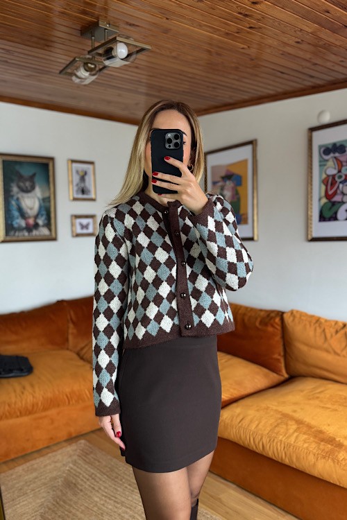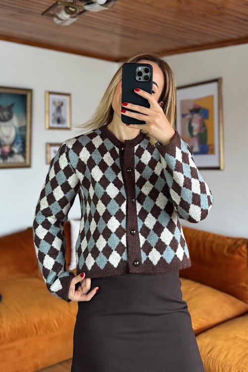 Baklava desenli kahve turkuaz renklerinde kullanışlı hırka.