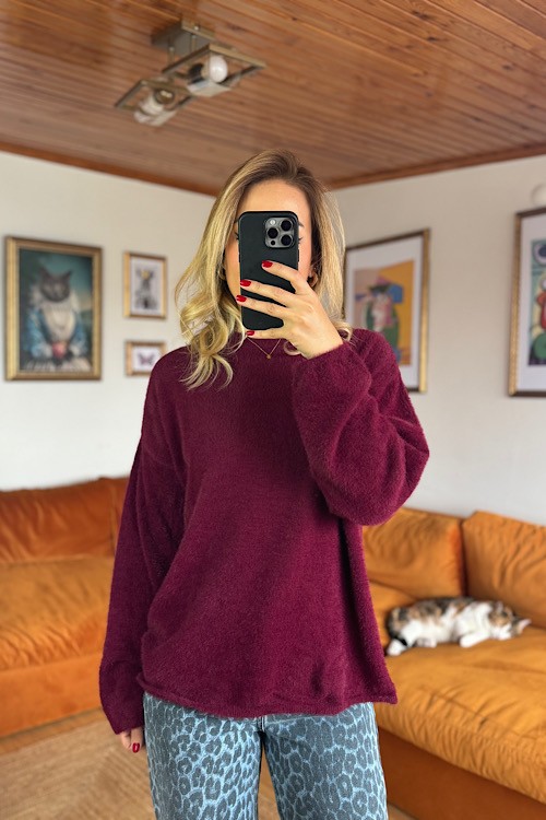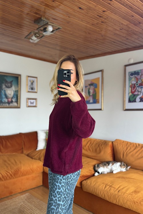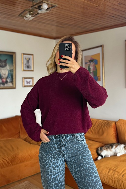 Bordo sakallı iplikten üretilmiş yumuşak dokuda kullanışlı triko.