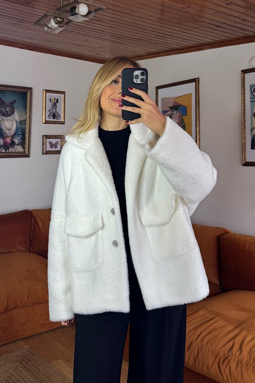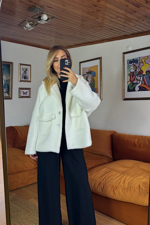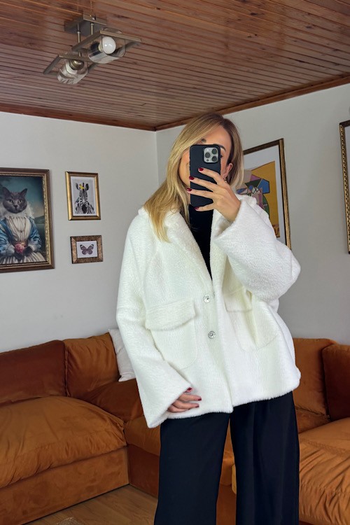 Ekru rengi oversize kalıp standart beden cepli kürk.