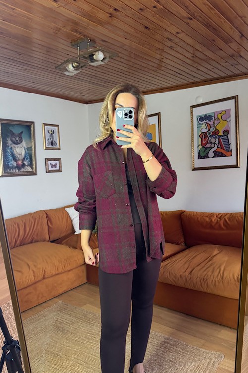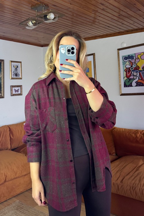Bordo tek cep detaylı ekoseli oduncu gömlek.