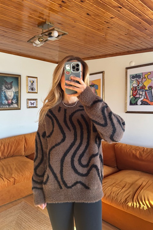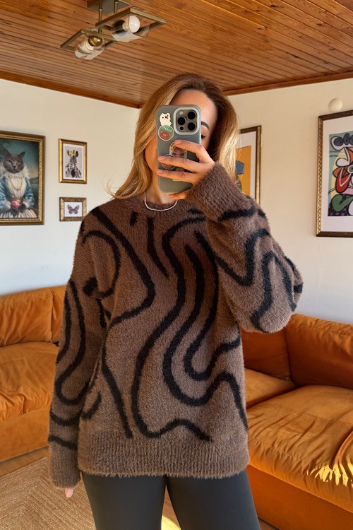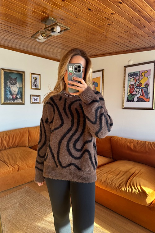 Kahve üzerine siyah çizgi deseni bulunan sakallı iplikten üretilmiş kalın kullanışlı kazak.