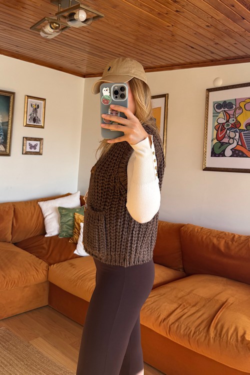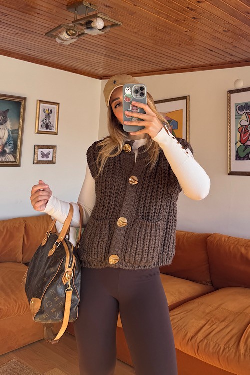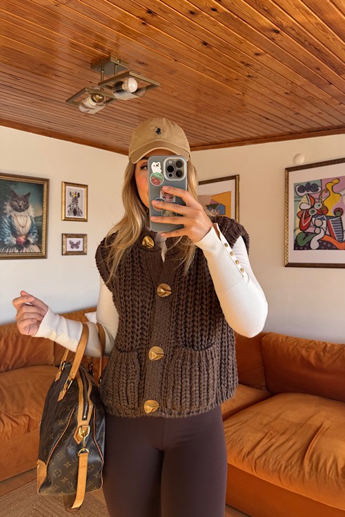Kahve kalın örgü gold düğme detaylı cepli yelek.