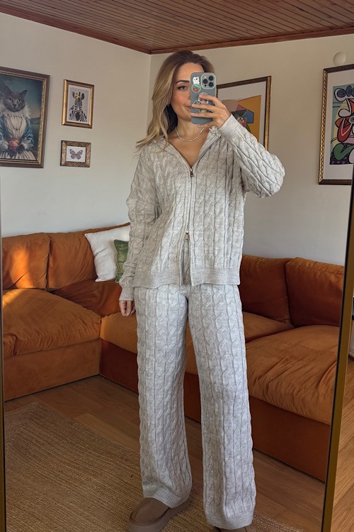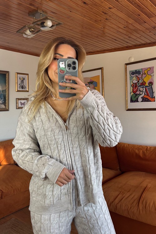 Bej rengi örgü desenli üstü kapşonlu triko takım