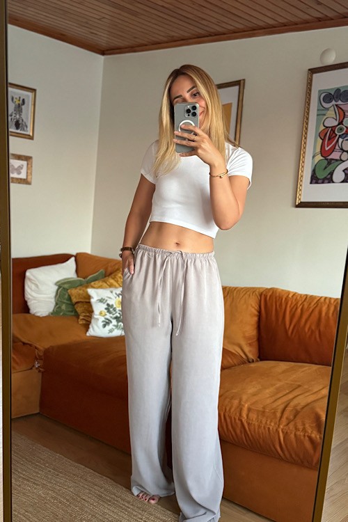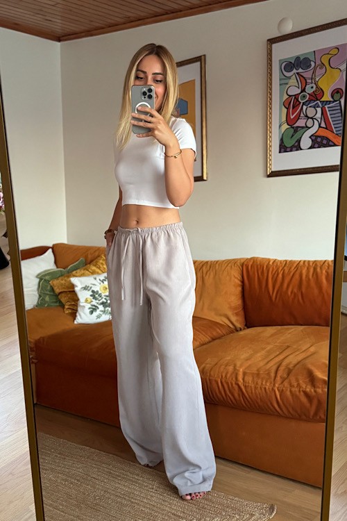Vizon rengi beli lastikli ve bağcıklı salaş pantolon